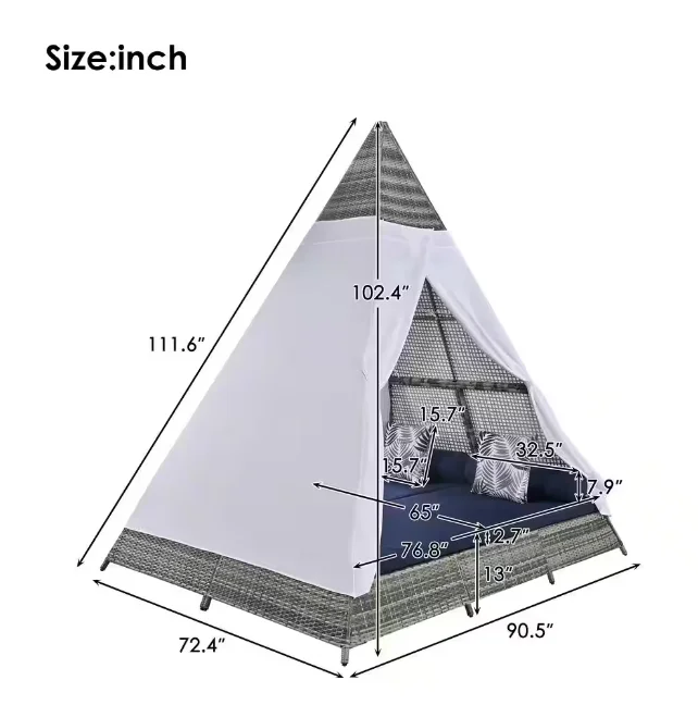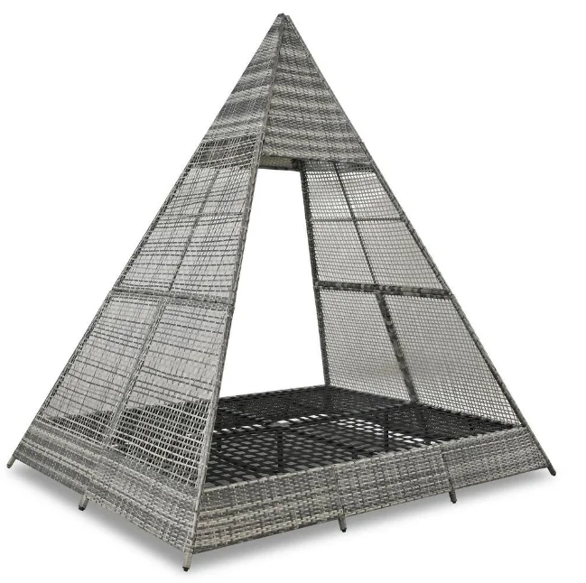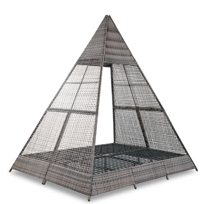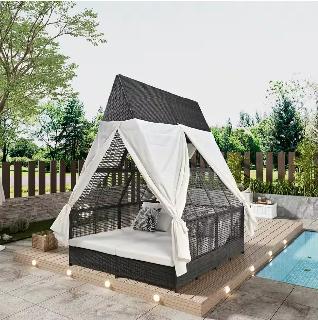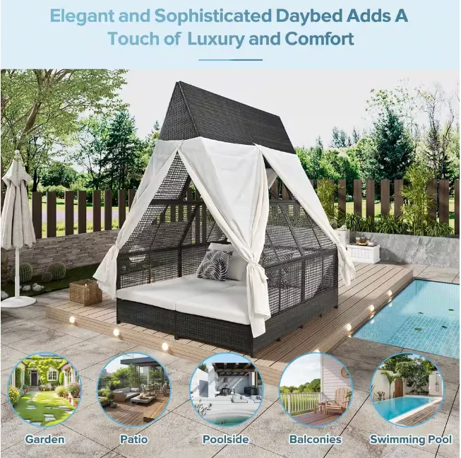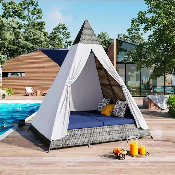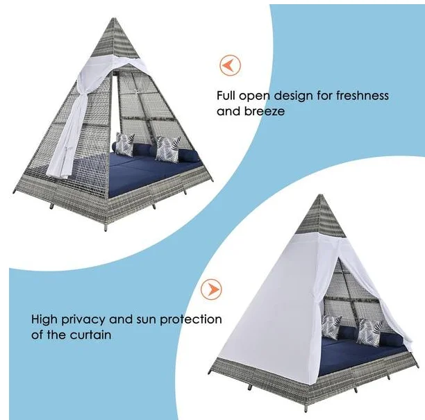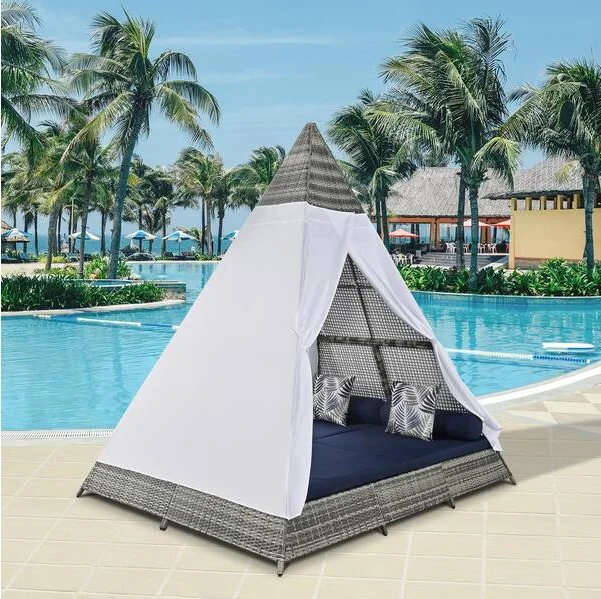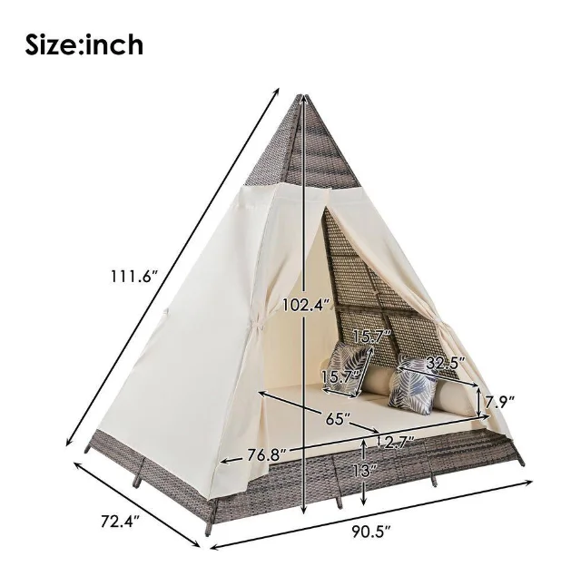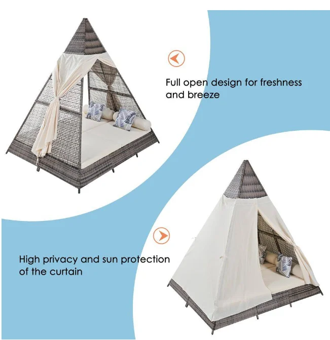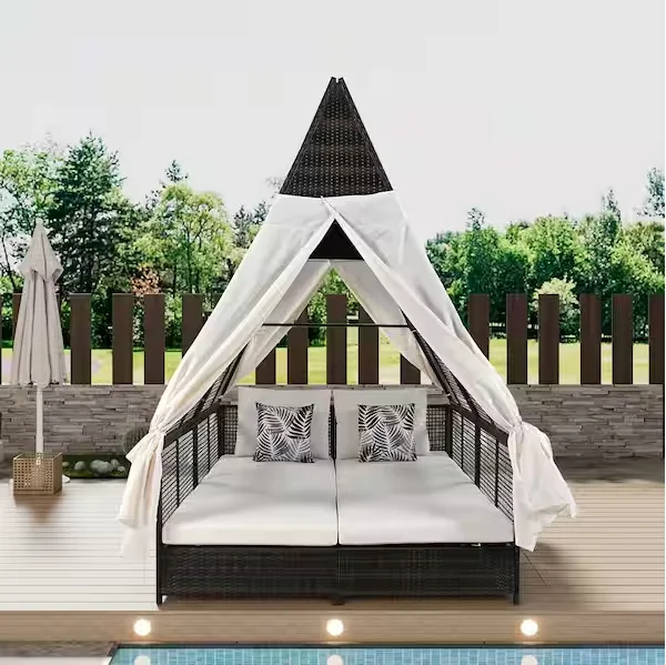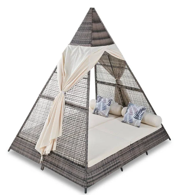 Brown Wicker Outdoor Day Bed with Beige Cushions and Colorful Pillows in Tent Shape